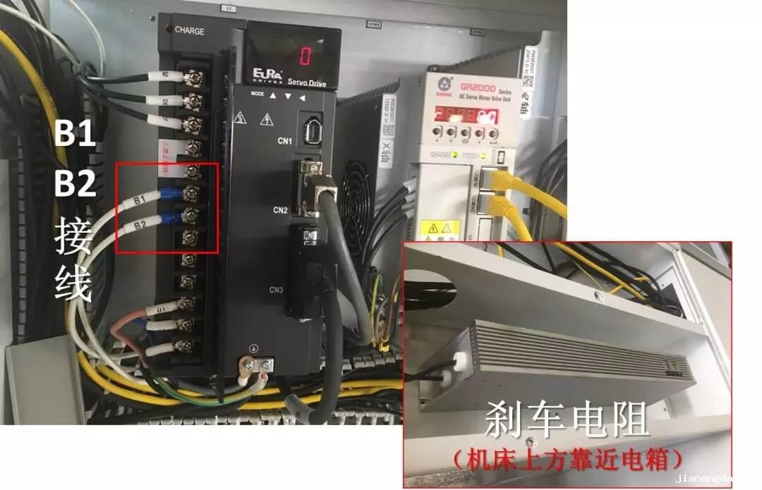 如果运行中,加减速过程中报警,我们就要检查刹车电阻是否正常,先断电,后拆下B1、B2接线,把万用表调到电阻模式,测量B1和B2间的电阻值,正常范围在75Ω-120Ω之间。(注意重新接线时不要接错)