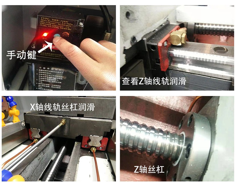 3、工作台表面、主轴等擦拭干净,涂上防锈油避免生锈影响精度。打开各轴防护罩,清理残留铁屑油污,把导轨、丝杠擦拭干净。 4、清理完成后,按住油泵手动键注油10-20秒,如下图所示,查看各润滑点是否有润滑油渗出。如果没有渗出,应检查主油管或计量件。