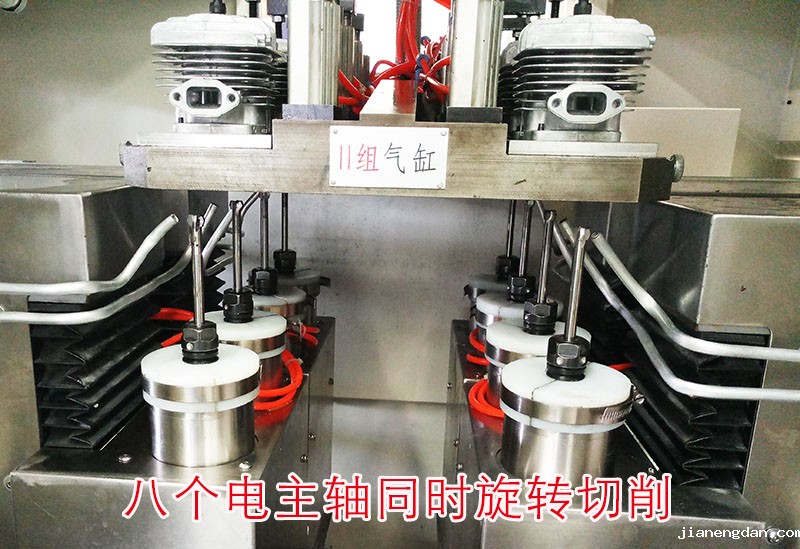 该机床配有七个进给轴、八个电主轴,且进给轴可实现联动,八个电主轴可同时旋转切削。七个进给轴分别为一个X轴、一个Y轴、四个Z轴、一个旋转轴。X、Y、Z轴用于实现进给插补铣削缸体进排气道、扫气道内轮廓线;旋转轴带动回转台,可将待加工缸体旋入加工区,同时将加工完毕的缸体旋出,以实现加工、装卸同时进行。旋转台上面放工件的旋转台,可一次装夹八个工件。装夹时缸体口部向下定向装夹,由气动旋转夹具同时压紧。位于工作台上的八个电主轴同时进给,可实现高速铣削,完成轮廓加工。