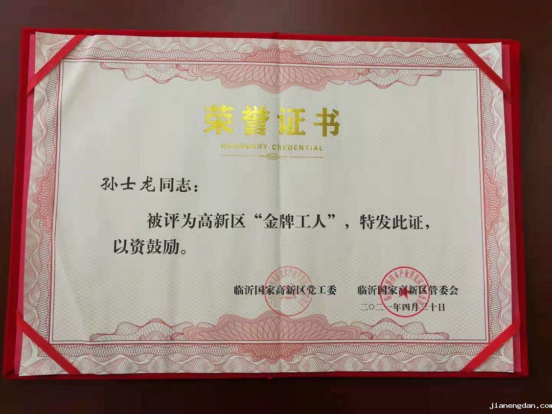 2021年4月30日我公司装配车间装配技师孙士龙同志被评为临沂市高新区“金牌工人”,特对孙士龙同志表示热烈的祝贺!